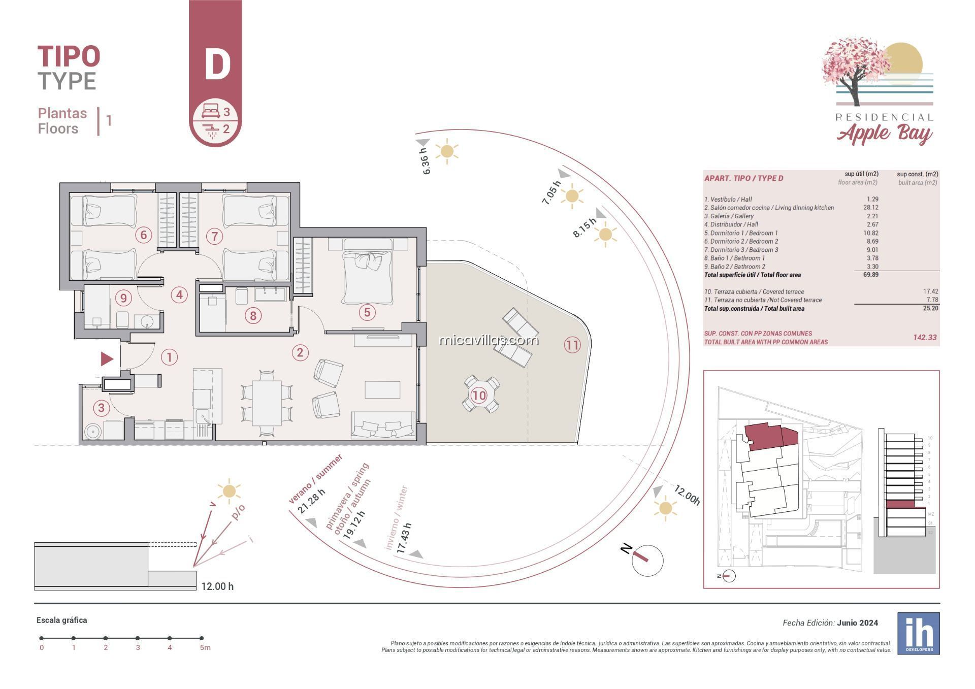 This apartment is a Type D unit and comprises 3 bedrooms, 2 bathrooms with built-in wardrobes, a living-dining room with an open-plan and fully equipped kitchen, and a 27 m² terrace.
